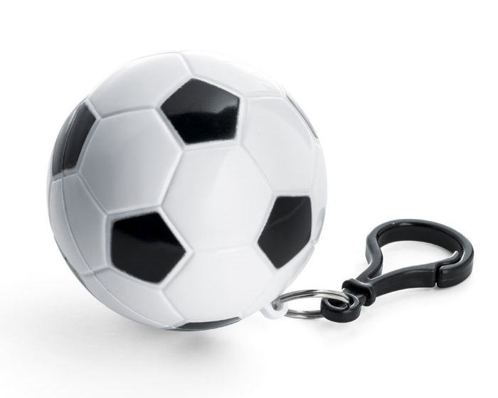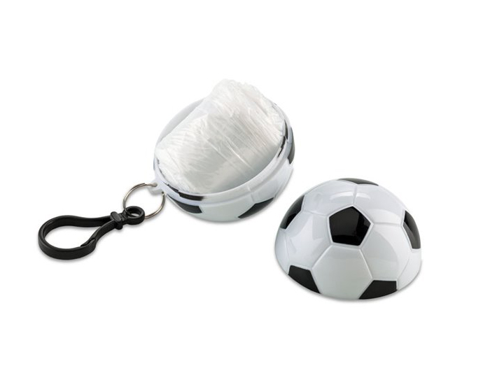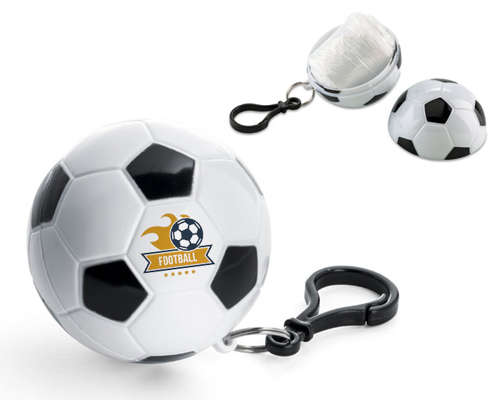 Impermeable con estuche portátil en forma de balón de fútbol y gancho para sujetar.