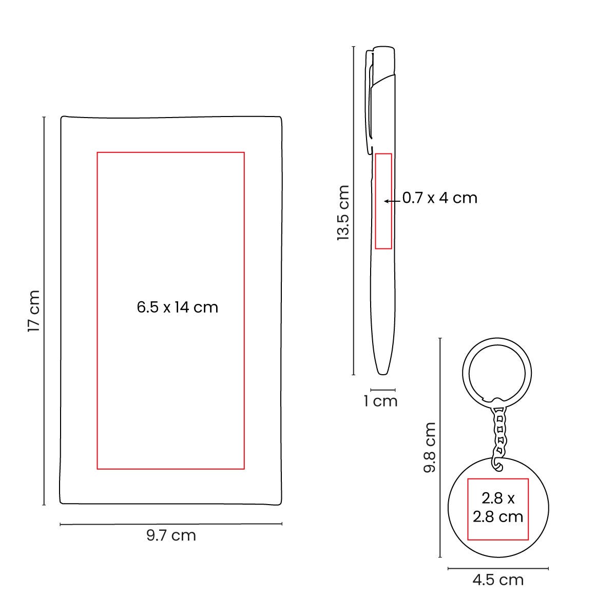 Medida 9.7 x 17 cm Caja / 1 x 13.5 cm Bolígrafo / 4.5 x 9.8 cm Llavero